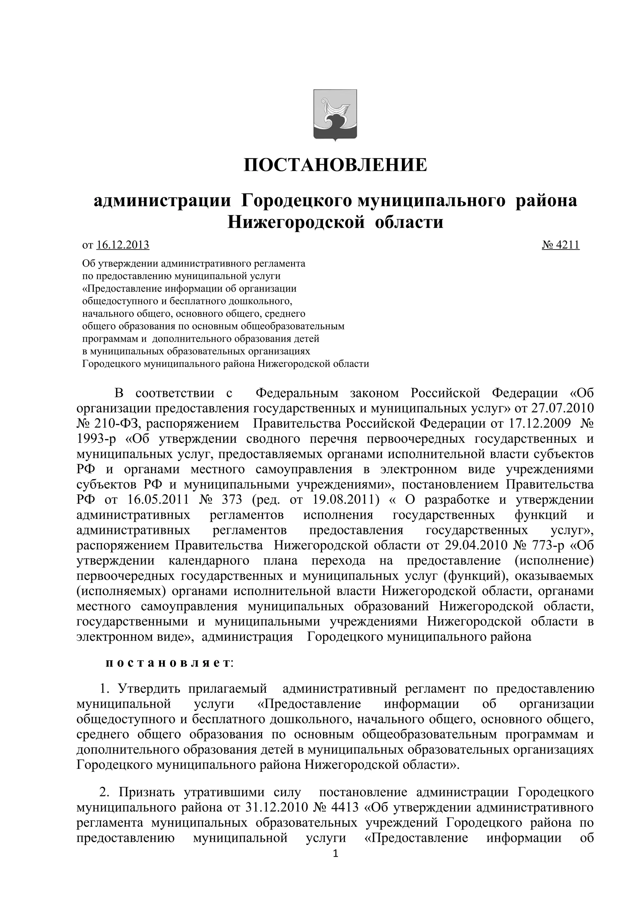 Постановление администрации городецкого муниципального района Нижегородской области утверждает административный регламент по предоставлению муниципальной услуги, связанной с информацией об образовании в муниципальных образовательных организациях. Документ определяет сроки, последовательность действий и обязанности по предоставлению информации о дошкольном и школьном образовании, а также организует информирование заинтересованных лиц. Постановление также обновляет и заменяет ранее действовавшие регламенты в этой области.