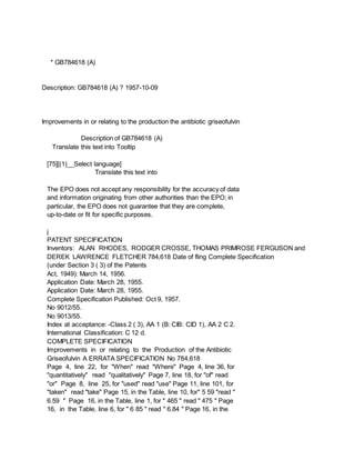 This document describes a patent for improvements in the production of the antibiotic griseofulvin under deep culture conditions. It finds that griseofulvin can be produced on a large scale through submerged aerobic culture of suitable organisms, such as Penicillium patulum, if the available nitrogen level in the culture medium is carefully controlled between 0.04-0.3% nitrogen. Optimum yields are obtained at nitrogen levels of 0.075-0.25%, with the specific optimum depending on factors like inoculum type and fermenter size.