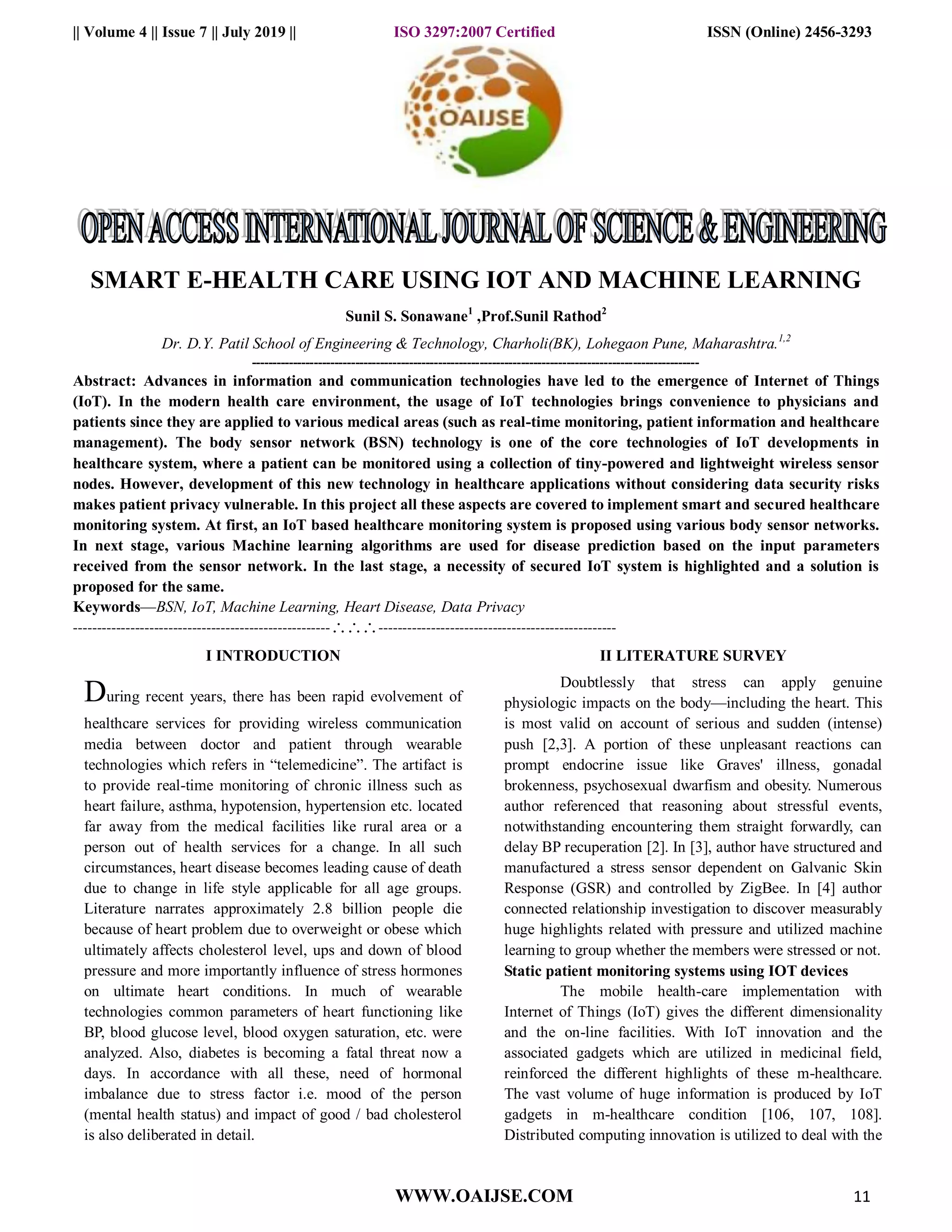The document summarizes a proposed smart e-health care system using IoT and machine learning. It begins with an introduction to how advances in IoT and communication technologies have enabled remote health monitoring systems. It then reviews related literature on stress sensors and IoT solutions applied to healthcare.