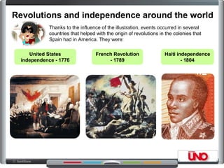 1) Several independence revolutions around the world in the late 18th century helped inspire independence movements in Spanish colonies, including the United States in 1776, France in 1789, and Haiti in 1804.