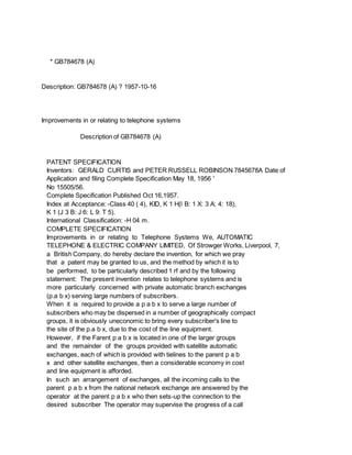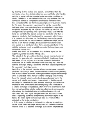 This document describes improvements to telephone systems, specifically regarding private automatic branch exchanges (PABX) serving large numbers of subscribers across multiple locations. It details a system with a parent PABX connected via two-wire tie-lines to satellite automatic exchanges. The parent PABX operator can set up calls to subscribers on satellite exchanges and receive visual supervisory indications of call progress over the tie-lines. This is achieved through signals sent on a non-speaking conductor and distinctive signals involving potential reversals at the tie-line conductors.