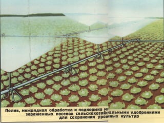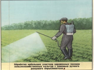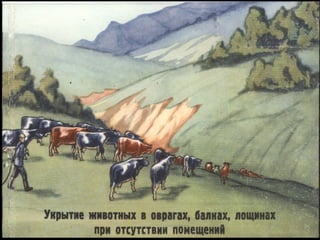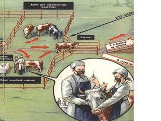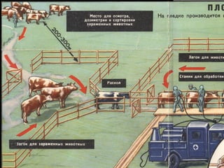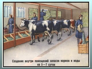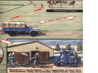 Документ описывает организацию защиты сельскохозяйственных животных и растений, включая меры против радиации и биологических средств, включая этапы лучевой болезни у животных и специфические методы защиты. Уделяется внимание также защите водоемов и продуктов животноводства, проведение мероприятий по обеззараживанию и дезактивации. Подробно рассматриваются способы эвакуации животных и защиты растений от современного воздействия.