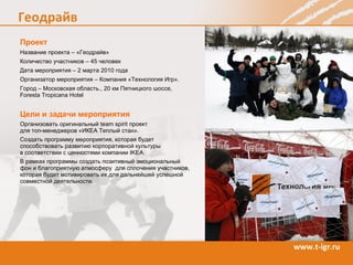 Проект 'Геодрайв' — это мероприятие для топ-менеджеров Ikea, проведенное 2 марта 2010 года, организованное компанией 'Технология игр' с 45 участниками. Программа включает фотокроссы, лесное ориентирование и командные испытания, направленные на развитие корпоративной культуры и командного духа. Участники преодолевают различные маршруты, выполняют задания и зарабатывают баллы, активно соперничая за победу.