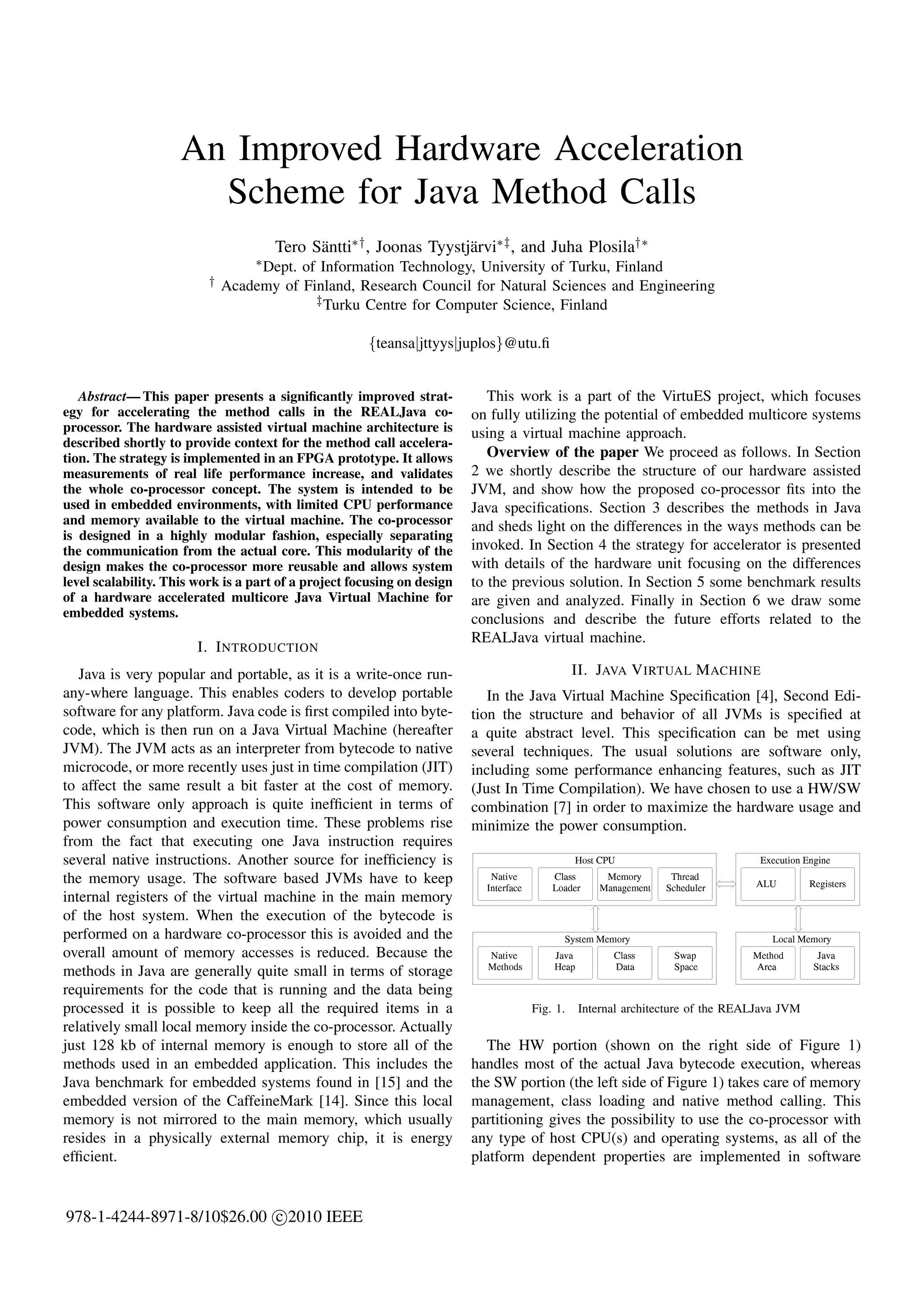 This paper presents an improved hardware acceleration scheme for Java method calls in the REALJava coprocessor. The strategy is implemented in an FPGA prototype and allows for measuring real performance increases. It validates the coprocessor concept for accelerating Java bytecode execution in embedded systems with limited CPU performance and memory availability. The coprocessor architecture is highly modular, separating communication from the execution core to improve reusability and allow for system scalability.