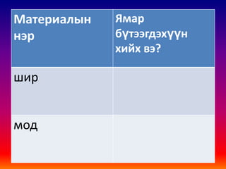 Хүний хөдөлмөрөөр хийхэд бий болсон юмсыг бүтээгдэхүүн гэнэ.Ямар нэг бүтээгдэхүүн хийхэд зориулан бэлдсэн зүйлийг материал гэнэ. - 8.