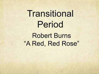 This document provides information about an English poetry course taught in the 2013 first term. The course title is "poetry" with code LANE 447. It is instructed by Dr. Fatma Elias. The document then presents information about Scottish poet Robert Burns, analyzes his famous poem "A Red, Red Rose", and discusses themes of love and passion in the poem. Figures of language and a summary of the poem are also included. Resources on the poet and poem are listed at the end.