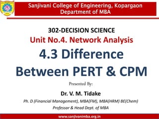 This document discusses the differences between PERT and CPM network analysis techniques. It notes that PERT is probabilistic while CPM is deterministic, PERT handles non-repetitive activities while CPM repetitive activities, PERT is task/event oriented while CPM is activity oriented, and PERT focuses on time calculations while CPM considers time and cost tradeoffs. Examples provided of uses include R&D projects using PERT and construction projects using CPM. The document aims to help students understand the differences between PERT and CPM network analysis methods.