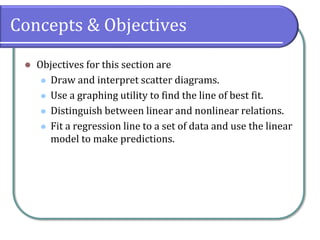 This document discusses fitting linear models to data, including how to create and interpret scatter plots, find the line of best fit, and differentiate between interpolation and extrapolation. It provides examples using cricket chirping data and gasoline consumption trends, emphasizing the importance of correlation coefficients in assessing linearity. Additionally, it includes instructions for using graphing utilities like Desmos to model data and make predictions.