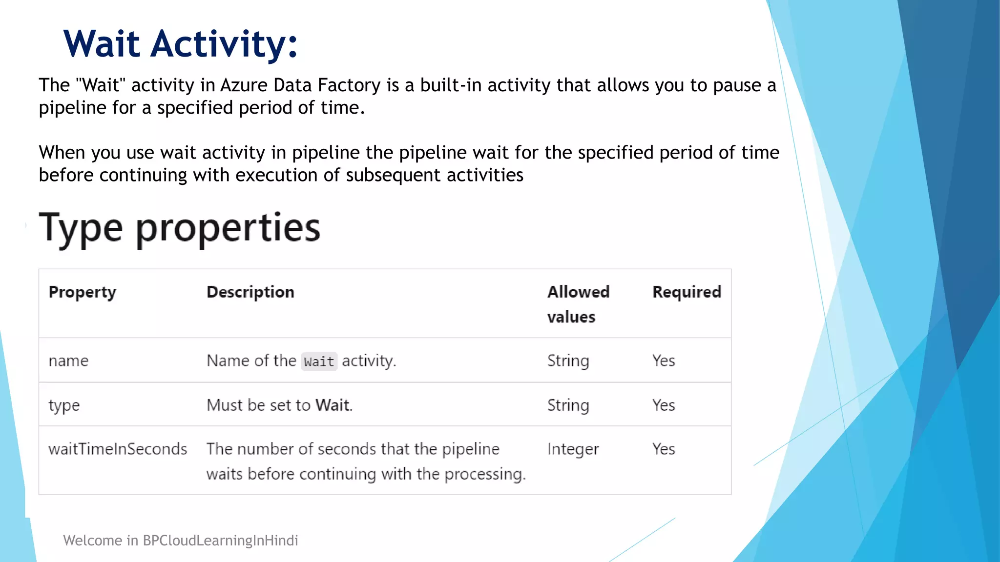 The Wait activity in Azure Data Factory pauses a pipeline for a specified period of time before continuing execution of subsequent activities. It allows inserting delays into pipelines without needing additional logic or resources. The Wait activity can be used to introduce waits between steps or create regular intervals for recurring pipelines.
