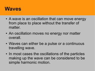 The document discusses different types of waves including transverse waves, where the vibration is perpendicular to the direction of propagation, and longitudinal waves, where the vibration is parallel. It also covers characteristics of waves like frequency, wavelength, amplitude, intensity, and speed; how waves transfer energy without transferring matter; and the electromagnetic spectrum.