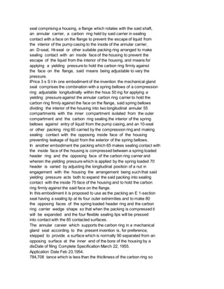 The document describes two embodiments of a mechanical gland seal for preventing liquid leakage along rotor shafts of rotary pumps. The first embodiment uses a spring bellows to apply pressure to a carbon ring, sealing it against the shaft flange. An O-ring additionally seals the interior from the exterior of the housing. The second embodiment uses a spring-loaded header ring compressing an H-section seal between the header and a carrier holding the carbon ring, sealing both the interior and along the shaft flange.