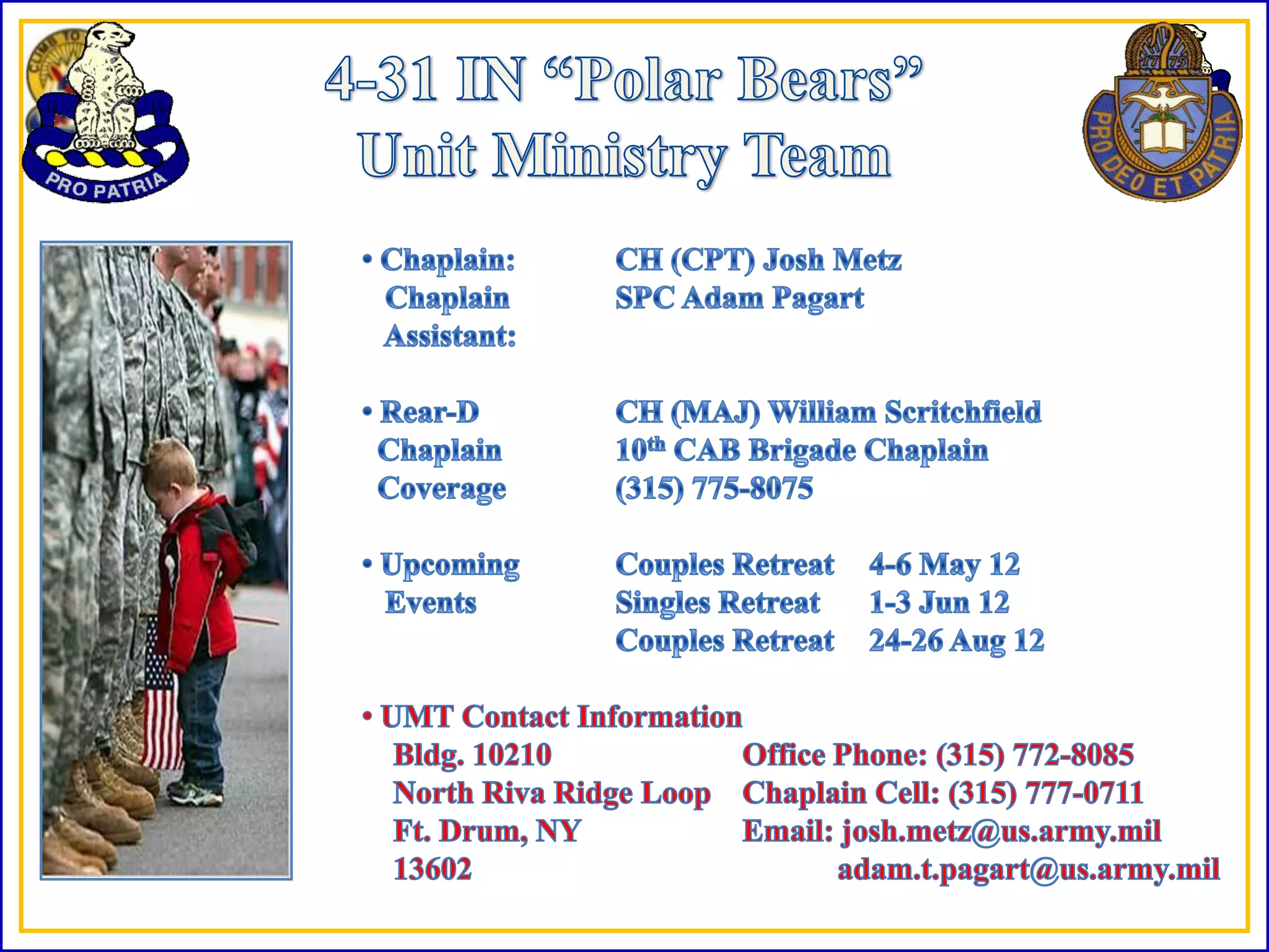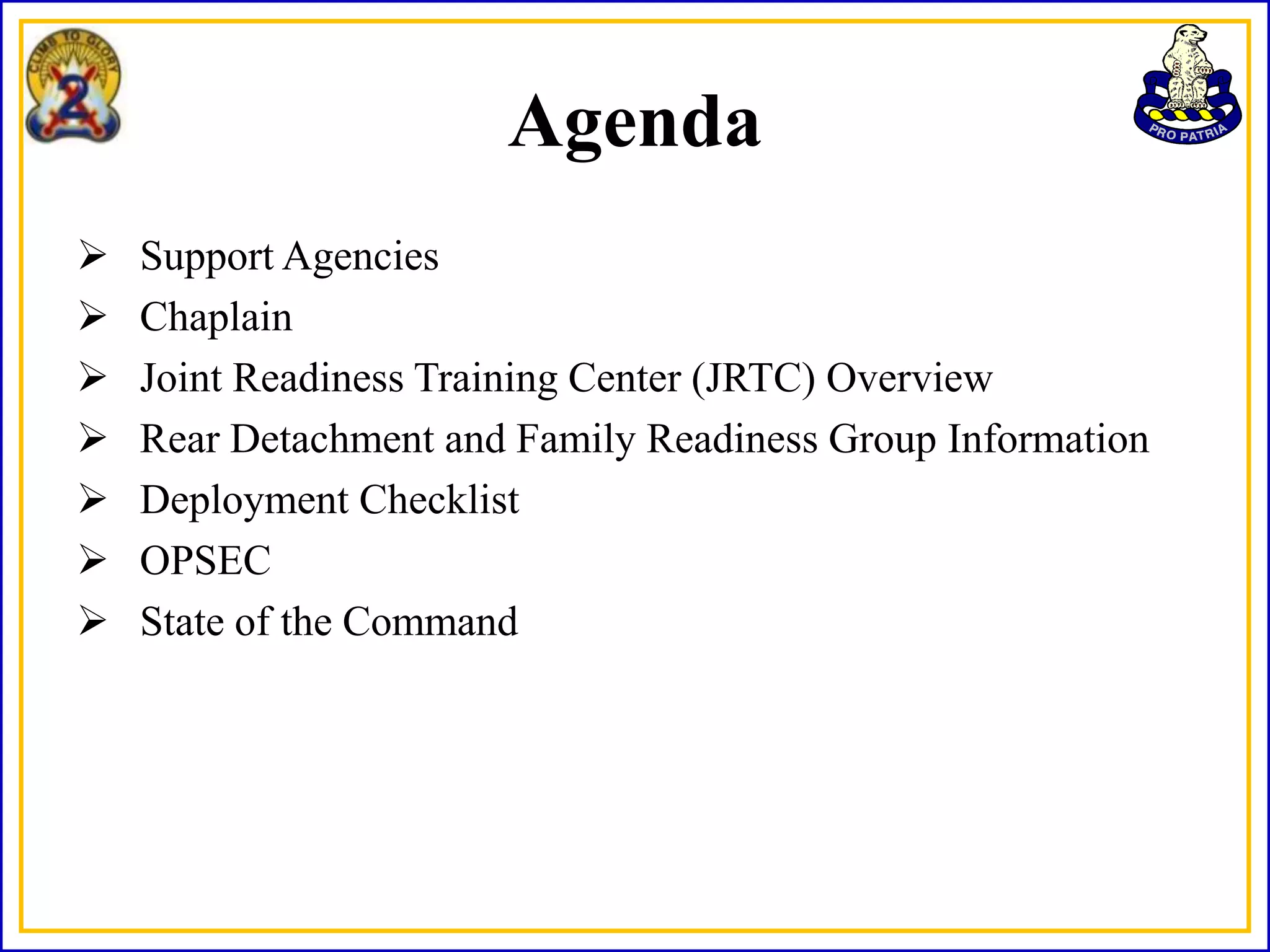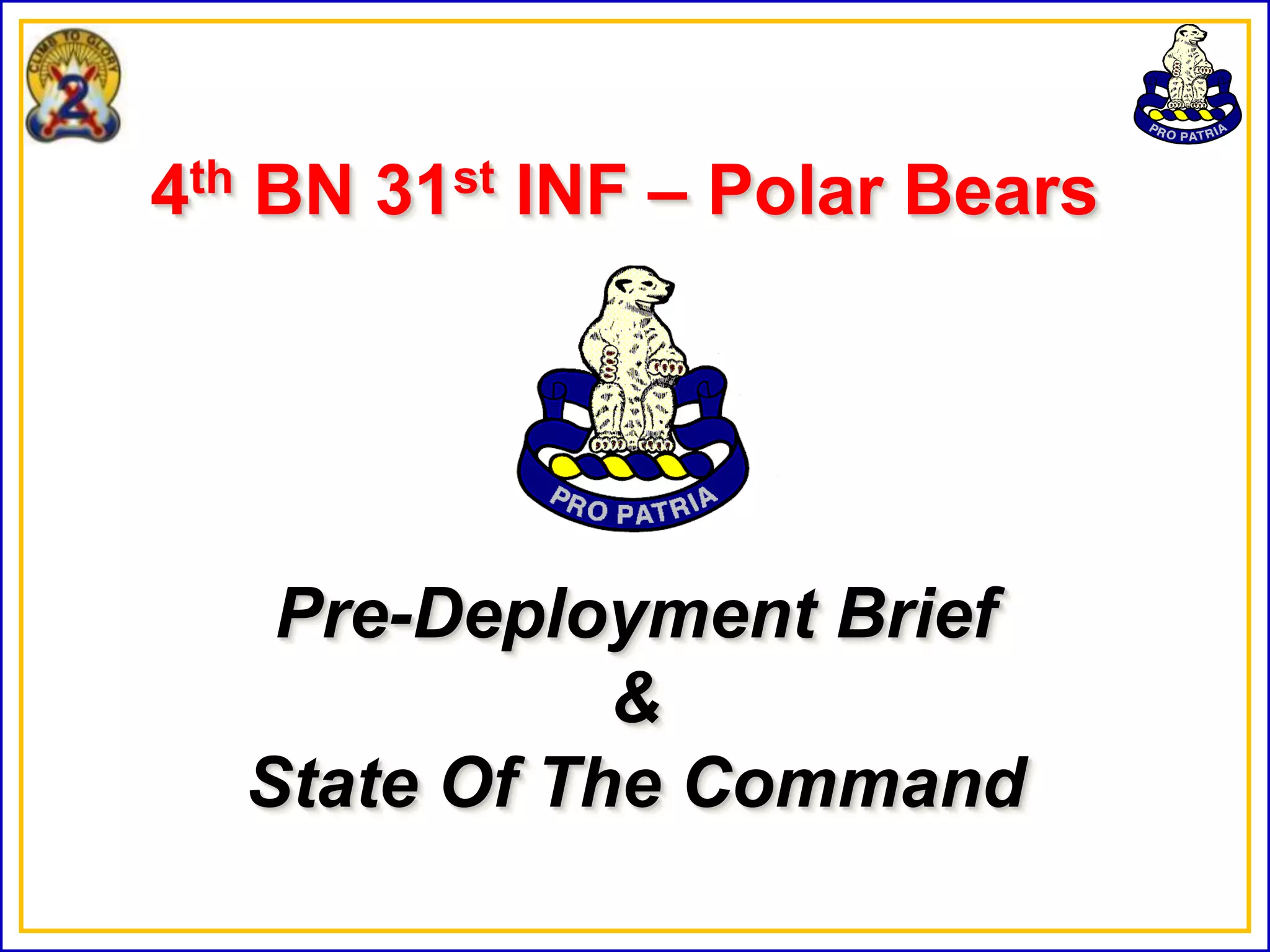 The document provides information about a pre-deployment briefing for the 4th BN 31st INF Polar Bears unit. It includes an agenda covering support agencies, the Joint Readiness Training Center overview, rear detachment and family readiness group details, a deployment checklist, and operational security practices. It also provides a state of the command section with upcoming unit training events and timelines.