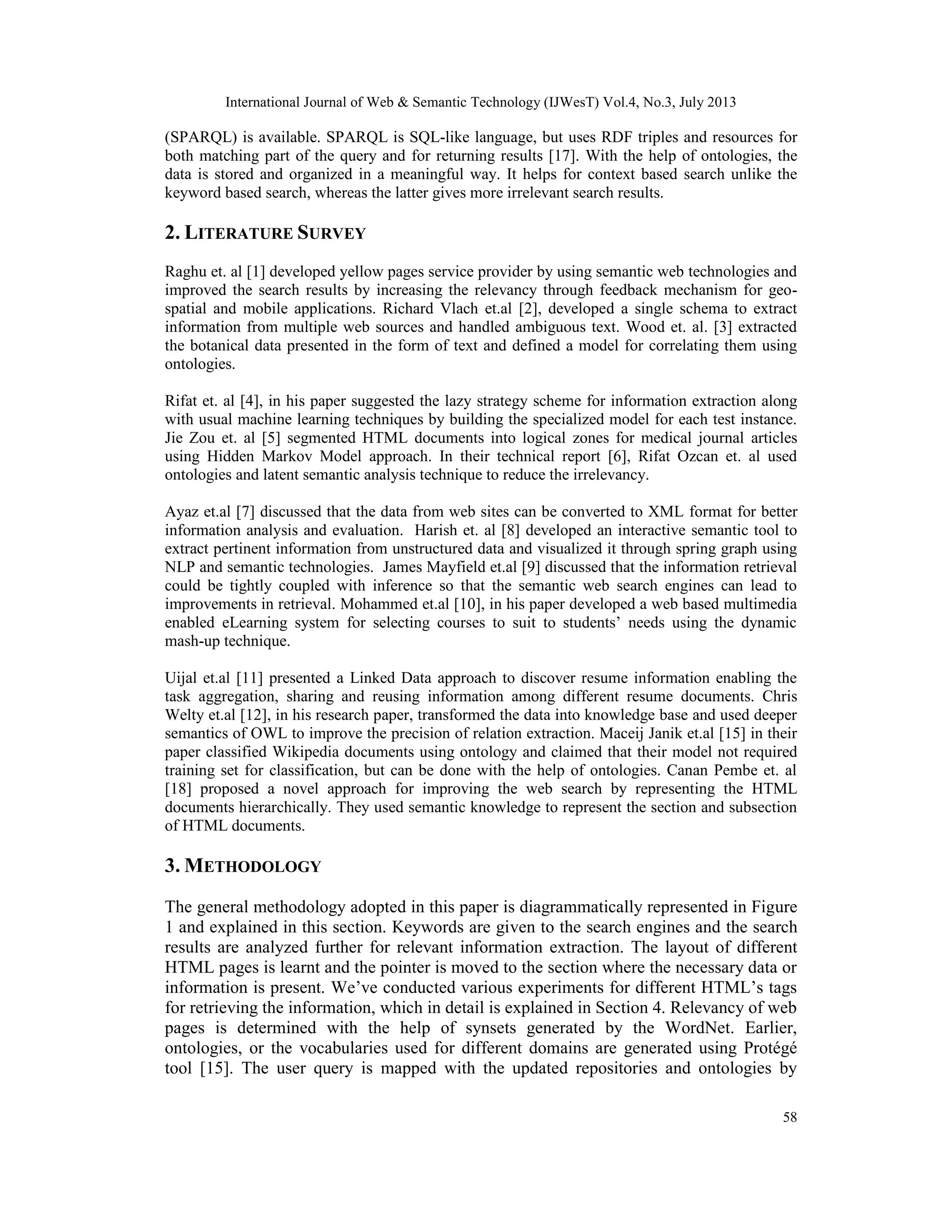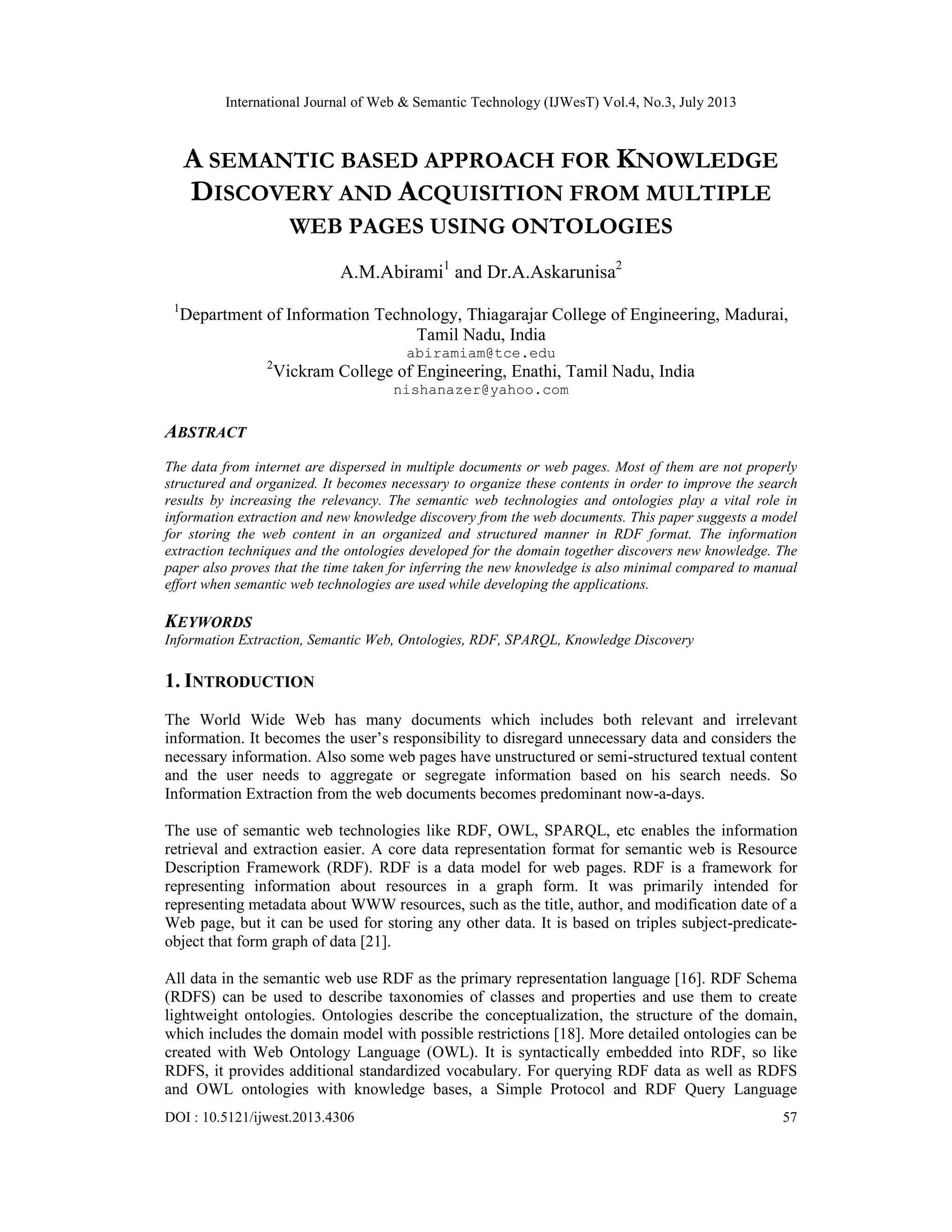 This document describes a semantic-based approach for knowledge discovery and information extraction from multiple web pages using ontologies. It presents a model for storing web content in an organized, structured RDF format. Information extraction techniques and developed ontologies can then discover new knowledge with minimal time compared to manual efforts. The paper details two experiments applying this approach. Experiment 1 extracts staff profiles from web pages into RDF, discovering related research colleagues. Experiment 2 extracts student data from HTML tables into XML/RDF, enabling faster querying and analysis versus manual parsing. The approach effectively organizes unstructured web data for knowledge inference and acquisition.