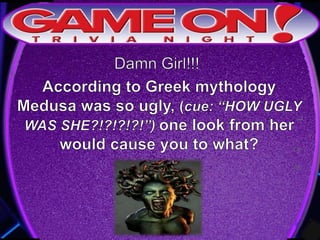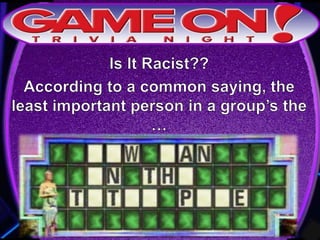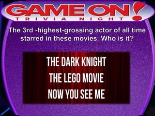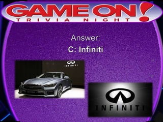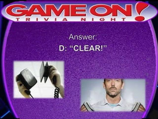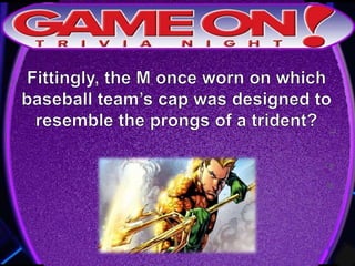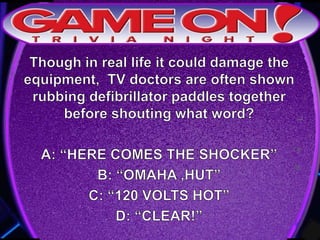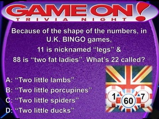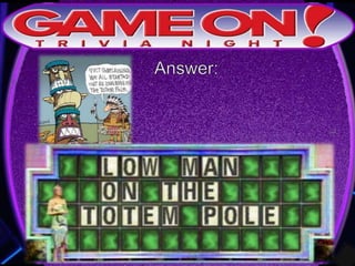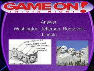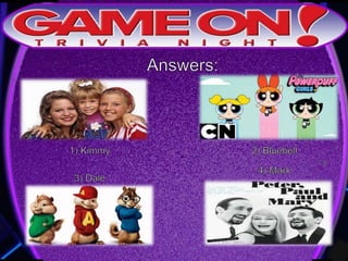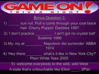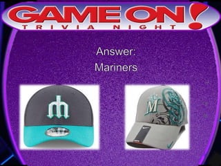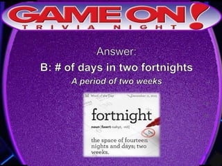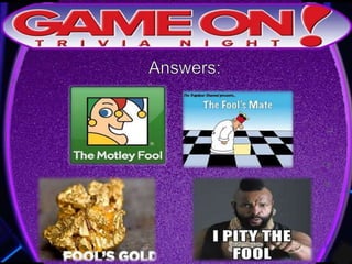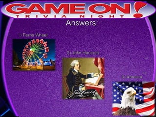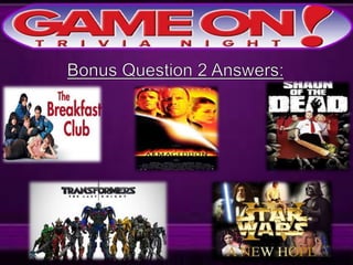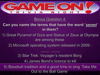 The document provides rules for a trivia game called GameOn Trivia on Facebook. Players are instructed to add their team photo and name to earn a free point. The rules specify that teams must choose a name, answer questions on the front of the answer sheet which will be collected, and answer bonus questions on the back with five possible answers also collected. Cellphones are not allowed during gameplay. A three minute break is announced for snacks and drinks.
