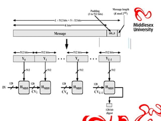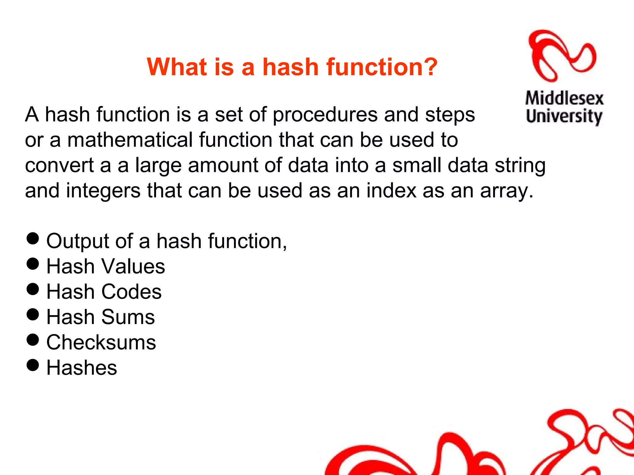 This document discusses hash functions and their analysis for a network security seminar. It begins by defining a hash function as a mathematical function that converts a large amount of data into a small string of integers. Common applications of hash functions include hash tables for quickly searching data, eliminating data redundancy, caches, bloom filters, and pattern matching. Cryptographic hash functions have properties like preimage and second preimage resistance as well as collision resistance. Popular cryptographic hash functions discussed include MD2, MD4, MD5, SHA-1, and SHA-2, along with their advantages, limitations, and examples of attacks.