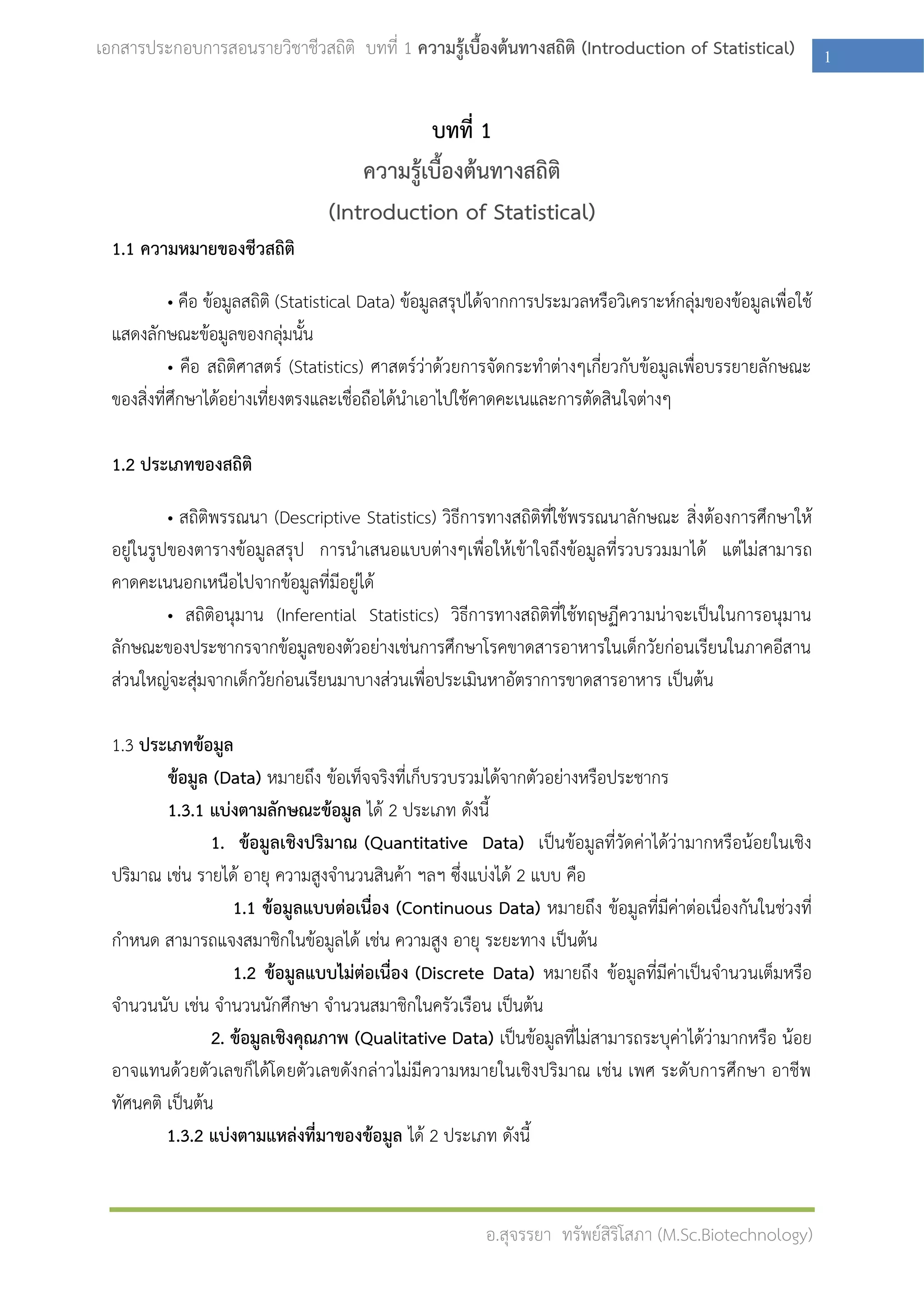 เอกสารประกอบการสอนรายวิชาชีวสถิติ บทที่ 1ความรู้เบื้องต้นทางสถิติ (Introduction of Statistical) 8