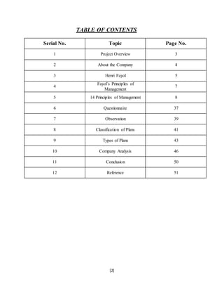 This project report analyzes types of plans and Henri Fayol's principles of management, specifically in the context of McDonald's. It highlights the significance of planning in management and discusses Fayol's 14 principles, including division of work, authority and responsibility, and discipline, detailing their application in McDonald's operations. The report serves as an investigation into how these management tools facilitate efficient organization performance.