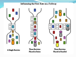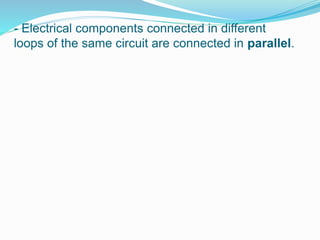 1) Electrical components in a parallel circuit provide separate conducting paths for current. Current divides between the paths, but voltage remains equal across all components.