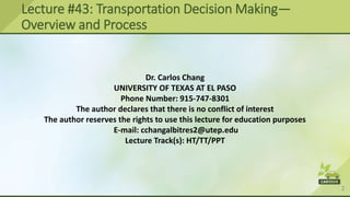 This document provides an overview of transportation decision making and asset management processes. It discusses transportation asset management (TAM) concepts and how they can be applied to make strategic, cost-effective decisions. TAM focuses on operating, maintaining, upgrading and expanding physical assets throughout their lifecycle through business and engineering practices. The document outlines the key steps in the TAM decision making process, including setting goals, assessing needs, evaluating projects, setting priorities, and monitoring performance. It also discusses the roles of various stakeholders and how to implement an integrated TAM system.