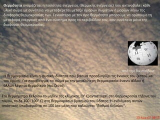 Θερμότητα ονομάζεται η ποσότητα ενέργειας (θερμικήςενέργειας) που ακτινοβολεί κάθε υλικό σώμα με συνέπεια να μεταφέρεται μεταξύ όμορων σωμάτων ή μορίων λόγω της διαφοράς θερμοκρασίας των. Γενικότερα με τον όρο θερμότητα μπορούμε να ορίσουμε τη μεταφορά ενέργειας από ένα σύστημα προς το περιβάλλον του, σαν συνέπεια μόνο της διαφοράς θερμοκρασίας.… από την ΒικιπαίδειαΗ θερμοκρασία είναι η φυσική ιδιότητα που βασικά προσδιορίζει τις έννοιες του ζεστού και του κρύου. Για παράδειγμα, το σώμα με την μεγαλύτερη θερμοκρασία έναντι άλλου ή άλλων λέγεται θερμότερο (πιο ζεστό).Στο θερμόμετρο Κελσίου το μηδέν της κλίμακας (0° C)αντιστοιχεί στη θερμοκρασία τήξεως του πάγου, το δε 100 (100° C) στη θερμοκρασία βρασμού του ύδατος. Η ενδιάμεση αυτών απόσταση υποδιαιρείται σε 100 ίσα μέρη που καλούνται "βαθμοί Κελσίου".