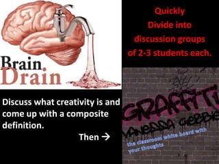 The document discusses creativity and defines it as the ability to go beyond traditional ideas and patterns to generate original and imaginative new ideas, forms, and interpretations. It also mentions the four stages of creativity: preparation, incubation, illumination, and verification. Finally, it prompts the reader to explain how they will apply the four stages of creativity to improve their grade in a current course.