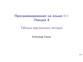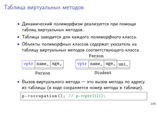 Документ посвящен таблицам виртуальных методов в C++, объясняющим динамический полиморфизм и его реализацию через виртуальные методы. Приводятся примеры классов, таких как 'person', 'student', 'teacher' и 'professor', демонстрирующие, как работают виртуальные функции и как они связаны с указателями на таблицы методов. Также рассматриваются особенности вызова методов, включая использование виртуальных методов в конструкторах и деструкторах.