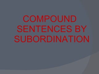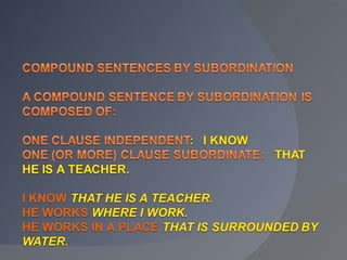 The document discusses different types of subordinate clauses including nominal clauses, adjectival clauses, and adverbial clauses. It explains that subordinate clauses are dependent clauses that cannot stand alone as sentences. Nominal clauses function as nouns, adjectival clauses function as adjectives, and adverbial clauses function as adverbs. The document also discusses restrictive and non-restrictive adjective clauses, and how punctuation differs between the two types.