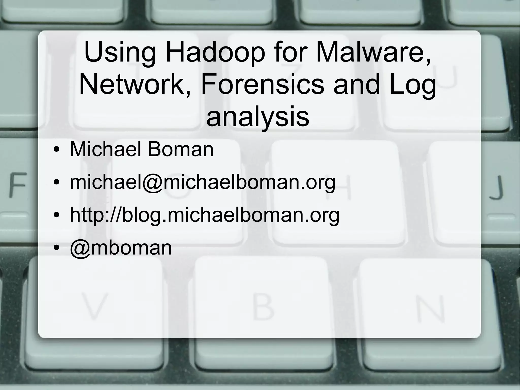 The document discusses utilizing Hadoop for various types of analysis, including malware, network forensics, and log analysis. It details how Hadoop's components and infrastructure can be employed for tasks like malware sample processing, packet capture analysis, and file information ingestion and reporting. Additionally, it includes cost-saving strategies for cloud storage and processing of these analyses.