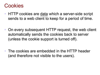 The document discusses the use of cookies and sessions in PHP for managing user data in web applications. It outlines how cookies maintain state across HTTP requests, their limitations, and how to manipulate them with PHP functions like setcookie(). It also explains session management, including how to start sessions, store data, and clear session variables, emphasizing the need to balance various data handling methods for effective web development.