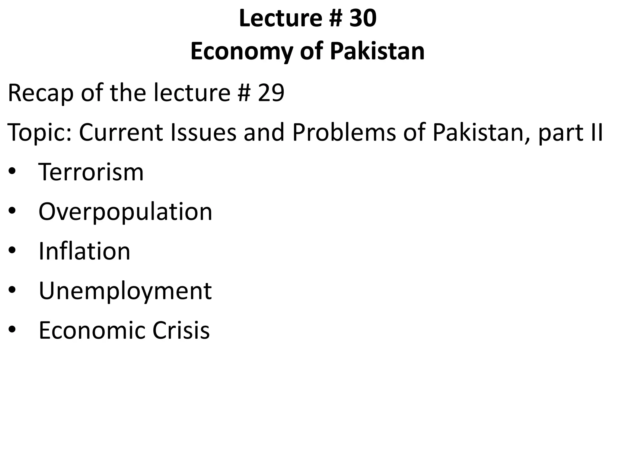 The document provides an overview of Pakistan's economy, including its history and current structure. It discusses key sectors like agriculture and industry. It also outlines important economic factors for development like capital, labor, power, transportation and education. Finally, it examines non-economic factors such as social, political and administrative influences.