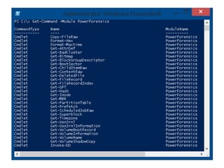 The document provides a comprehensive overview of NTFS analysis using PowerShell, detailing the functionalities of various cmdlets for forensic investigation. It emphasizes the importance of being forensically sound while collecting data, and illustrates the capabilities of the PowerForensics toolkit for examining disk structures and file systems. Key topics include raw access to physical drives, handling master boot records, analyzing the Master File Table, and utilizing alternate data streams for security purposes.