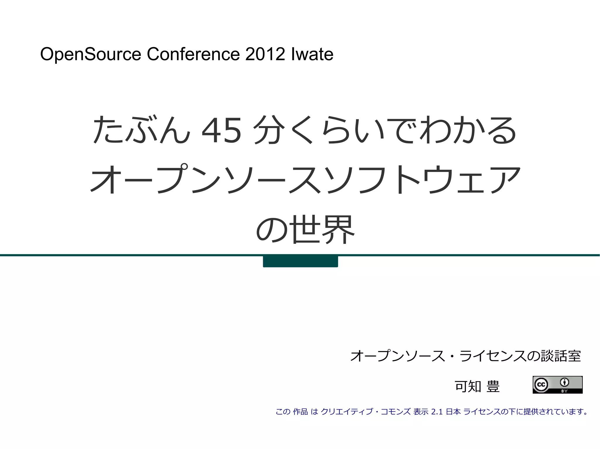 Iwate たぶん 45 分くらいでわかる オープンソースソフトウェア の世界 オープンソース・ライセンスの談話室 可知 豊 この 作品 は クリエイティブ・コモンズ 表示 2.1 日本 ライセンスの下に提供されています。