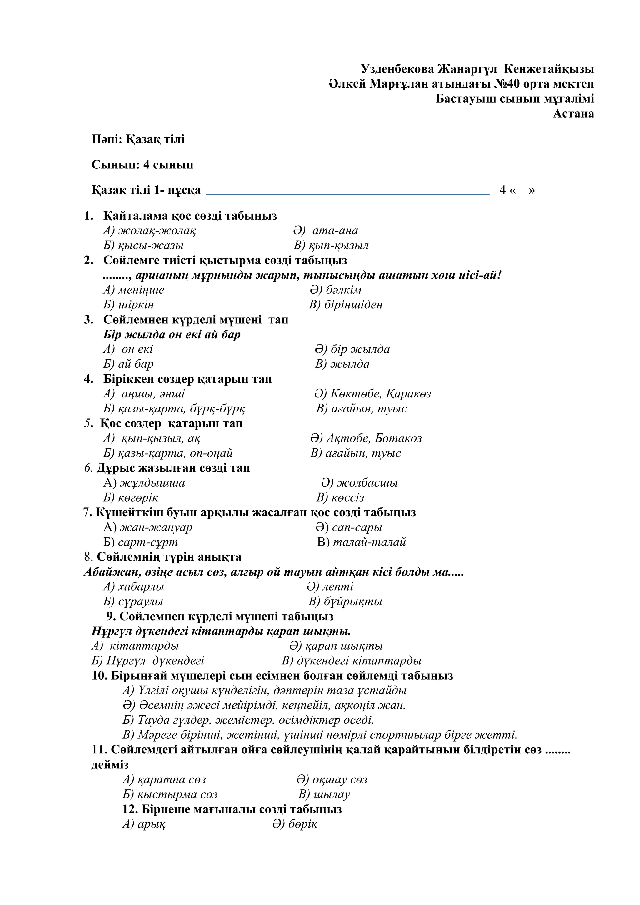 Қазақ тілі 1- нұсқа 4 « »