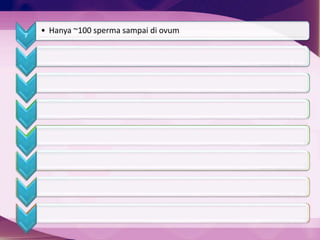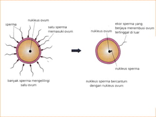 Dokumen ini menerangkan proses dari persenyawaan hingga kelahiran manusia. Proses dimulai dengan sperma yang bertemu dengan ovum hingga terbentuknya zigot, di mana zigot kemudian berkembang menjadi embrio dan menetap di dinding uterus. Akhirnya, setelah 9 bulan, proses kelahiran berlaku, termasuk pengeluaran fetus dan pemotongan tali pusat.