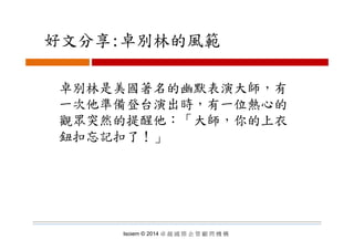 此文讨论了卓别林在演出中的细微举动,强调感激他人善意的重要性。卓别林解释他在演出中故意松开上衣扣子,以更真实地呈现角色,加深观众印象,而非立即纠正观众的误解。文章鼓励读者在面对类似情况时,选择感恩而非纠正。