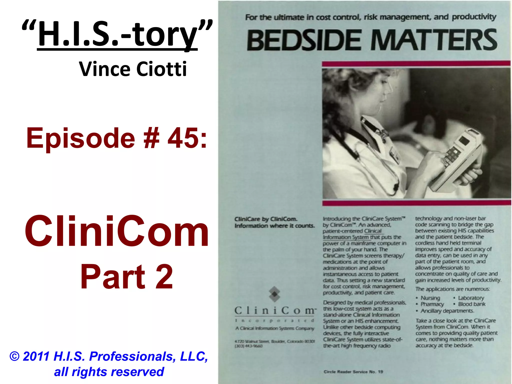 CliniCom was an early pioneer in bedside medication verification (BMV) decades ago. This episode shares insights from Don Gilchrist, former VP of Engineering at CliniCom. He recalls key people who supported CliniCom's survival, including Marshall Miller who provided early financing. Shirley Hughes led marketing and Terry Watson drove early sales. Peter Gombrich was the creative founder but was ousted before the company's success. Bill Brehm helped turn CliniCom around. CliniCom delivered innovations like wall-mounted devices, wireless BMV, and capturing vital signs, before others offered similar solutions. They made a real difference in patient care quality. More of CliniCom's story will be shared next time from