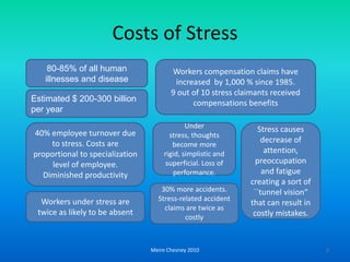 The document discusses the high costs of stress in the workplace, noting that stress contributes to increased health issues and worker absenteeism, with significant financial implications for employers. It presents a case study highlighting the cost of burnout, amounting to CHF 391,400 for a single employee over several years. The document advocates for techniques like Emotional Freedom Techniques (EFT) and meditation as effective stress management strategies, promoting a wellness program with a proven return on investment.