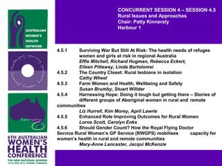 This document outlines the schedule for Concurrent Session 4.5 of a conference on rural issues and approaches. The session is chaired by Patty Kinnersly and consists of 6 presentations on topics related to women's health in rural communities, including the health needs of refugee women, the isolation of rural lesbians, health and safety issues for farm women, stories of Aboriginal women in remote areas, enhancing roles to improve outcomes for rural women, and a gender-based service from the Royal Flying Doctor Service.