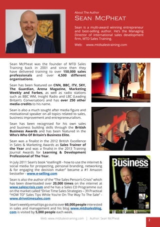 The document is a guide by Sean McPheat, founder of MTD Sales Training, emphasizing the importance of asking quality questions in sales interactions to build rapport and uncover client needs. McPheat, an award-winning sales trainer and author, shares various categories of sales questions meant to enhance communication and effectiveness in the sales process. The guide also provides insight into the author's background, his contributions to sales training, and resources for further learning.