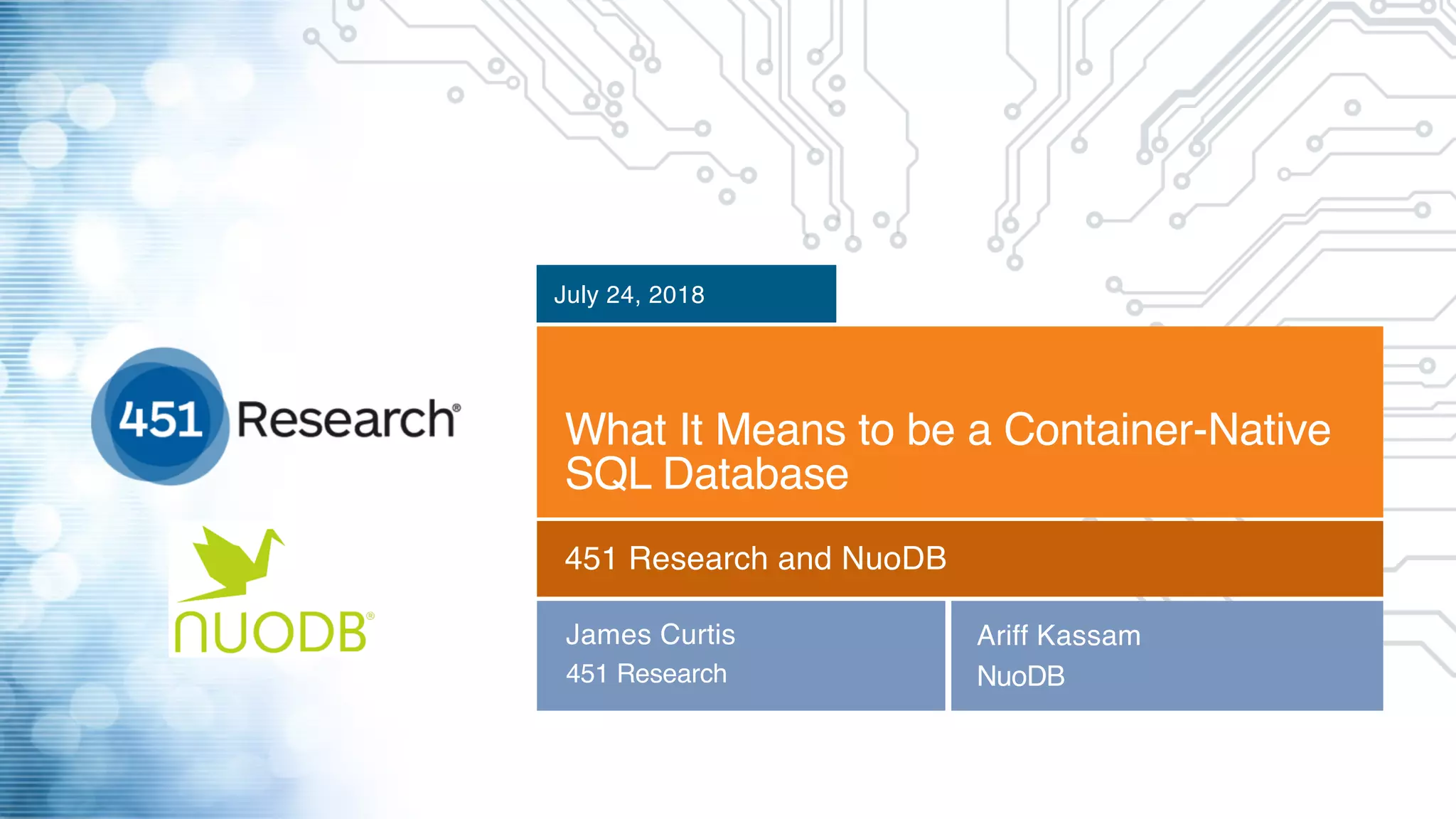 This document discusses how traditional SQL databases anchor enterprises to the past and hinder digital transformation efforts. It introduces NuoDB as a container-native SQL database that can be fully deployed within container platforms. NuoDB addresses limitations of traditional and NoSQL databases by providing elastic SQL, ACID compliance, zero downtime, and horizontal scalability while running in containers on commodity hardware and clouds.