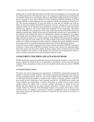 This document discusses security attacks on the Bring Your Own Device (BYOD) model. It begins with an abstract that introduces BYOD and its advantages for businesses but also the security risks it poses due to limitations of devices and emerging attacks. The document then provides a taxonomy of potential BYOD attacks and discusses advanced persistent threats and malware attacks in depth. It proposes solutions to mitigate BYOD attacks and evaluates the solutions based on the X.800 security architecture standard.