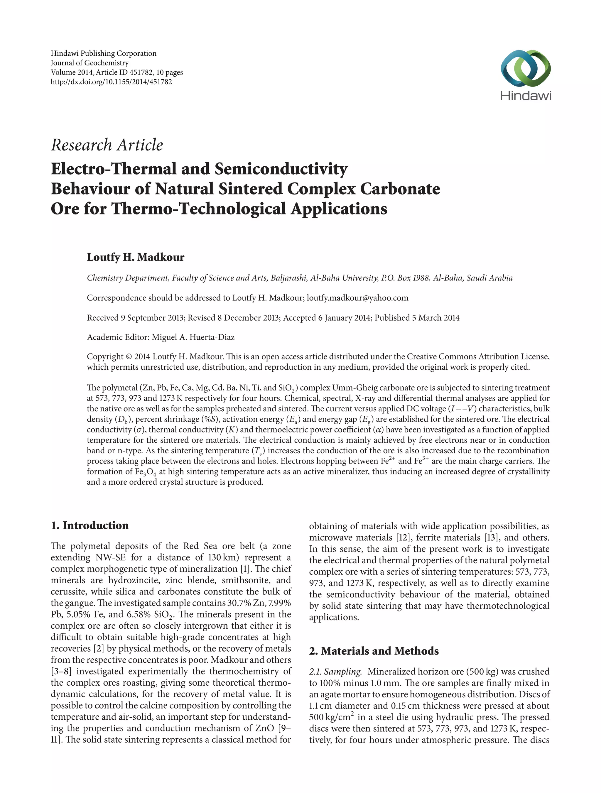 The research article investigates the electro-thermal and semiconductivity behavior of sintered natural complex carbonate ore at various temperatures. The study reveals that electrical conductivity increases with higher sintering temperatures, attributed to electron hopping between iron oxidation states and the formation of Fe3O4, which enhances crystallinity. Comprehensive analyses including chemical, spectral, and thermal techniques confirm changes in mineral composition and electrical properties due to sintering, indicating potential industrial applications.