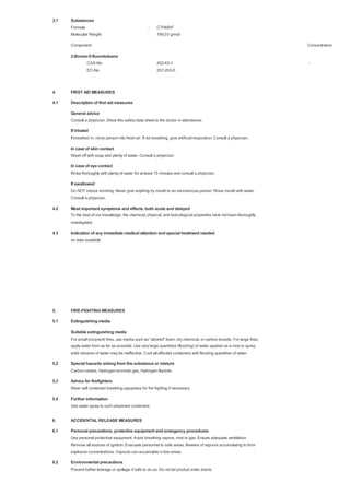 This document provides information on the chemical 2-Bromo-5-fluorotoluene (CAS 452-63-1) including its hazards, safe handling and storage, and physical properties. It identifies the chemical as flammable and an irritant to eyes, skin, and respiratory system. Personal protective equipment including gloves, protective clothing, and eye protection are recommended when handling it. The chemical has a flash point of 45°C and should be stored away from ignition sources in a cool, well-ventilated area.