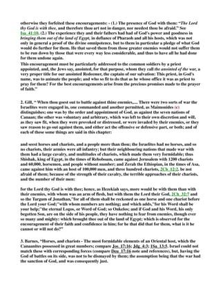 This document is a commentary on Deuteronomy 20, focusing on God's encouragement to Israel as they prepare for battle against formidable enemies, reminding them of His presence and past deliverance from Egypt. It discusses the role of a specially appointed priest, called the 'anointed of war', who was to address the troops and bolster their faith before engaging in combat. The commentary uses quotes from various commentators to explore these themes and highlight the importance of divine support in military endeavors.