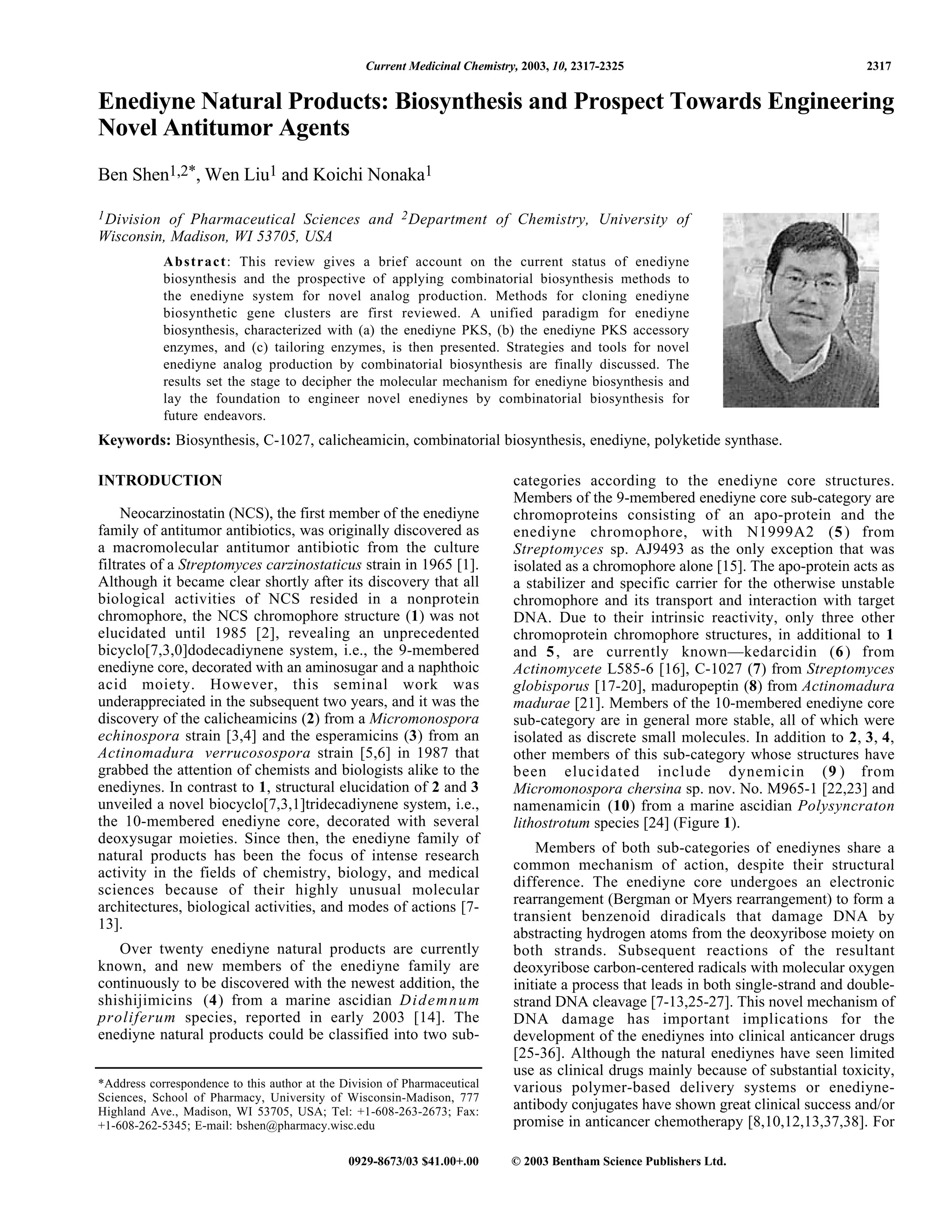 This document summarizes the current status of research on enediyne natural products, which are a class of antitumor antibiotics with an unusual bicyclo or biocyclo core structure. It reviews methods for cloning the biosynthetic gene clusters responsible for enediyne production. It then presents a unified paradigm for enediyne biosynthesis involving polyketide synthase enzymes, accessory enzymes, and tailoring enzymes. Finally, it discusses strategies for applying combinatorial biosynthesis techniques to engineer novel enediyne analogs with the goal of developing new antitumor agents.