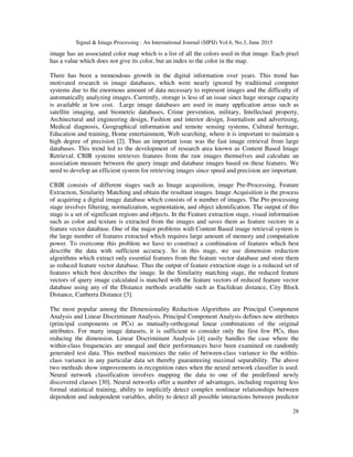 The paper compares two dimensionality reduction techniques, Principal Component Analysis (PCA) and Linear Discriminant Analysis (LDA), in the context of image processing for enhanced image retrieval from large databases. PCA is shown to perform better in terms of precision, recall, and computational efficiency compared to LDA. The study utilizes a neural network trained on reduced feature sets from both methods to improve the speed and accuracy of image searching.