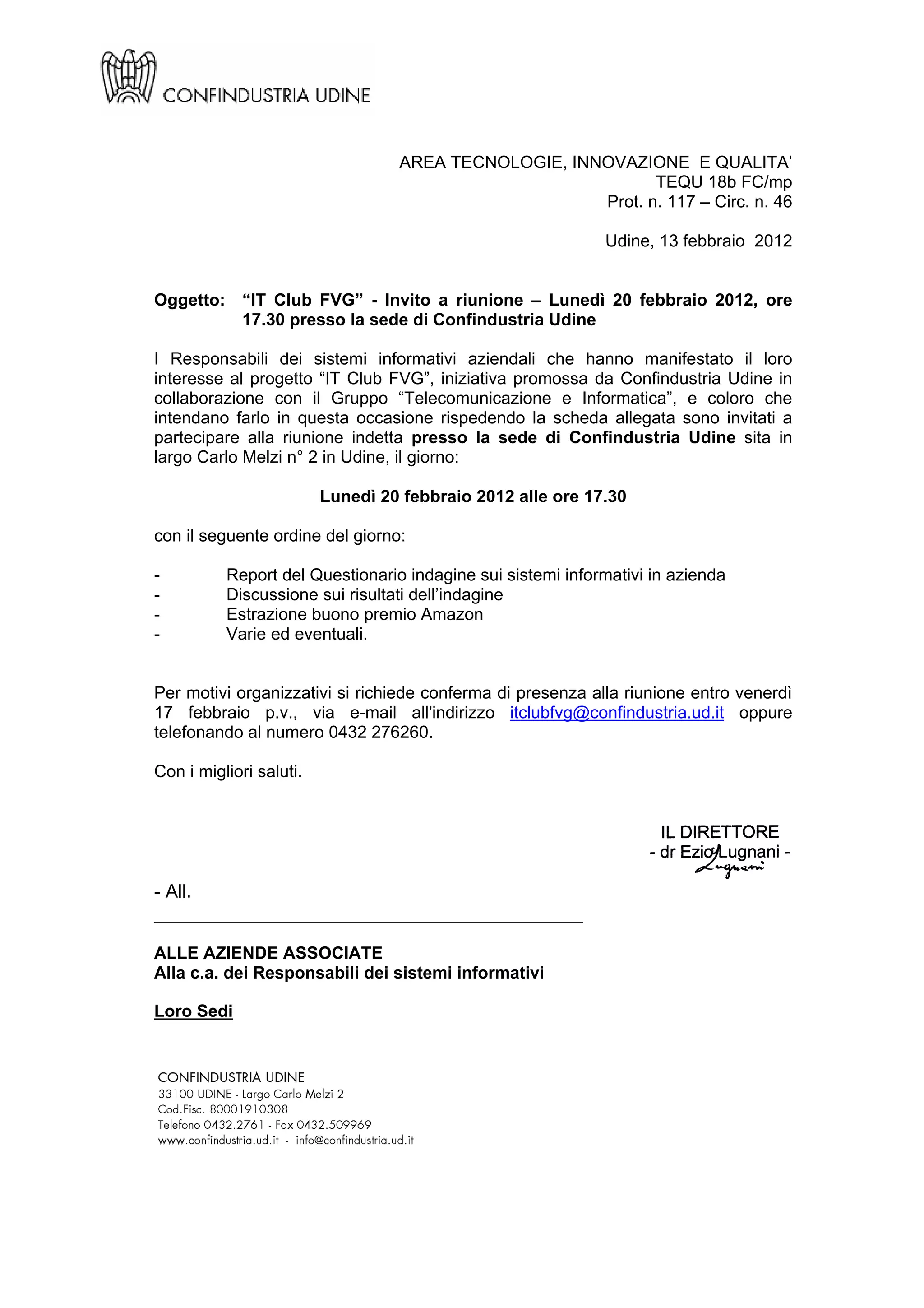 Il documento invita i responsabili dei sistemi informativi aziendali a una riunione dell' 'IT Club FVG' il 20 febbraio 2012 presso Confindustria Udine. L'ordine del giorno include la discussione dei risultati di un'indagine sui sistemi informativi, insieme ad altri punti vari. Si richiede conferma di partecipazione entro il 17 febbraio e sono indicate le modalità di iscrizione e pagamento al club.