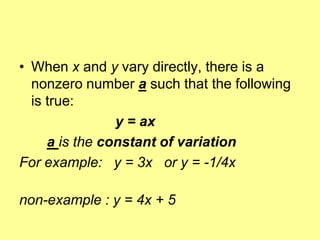 The document discusses direct variation, which is a relationship where two quantities vary proportionally such that their ratio remains constant. The key points are: