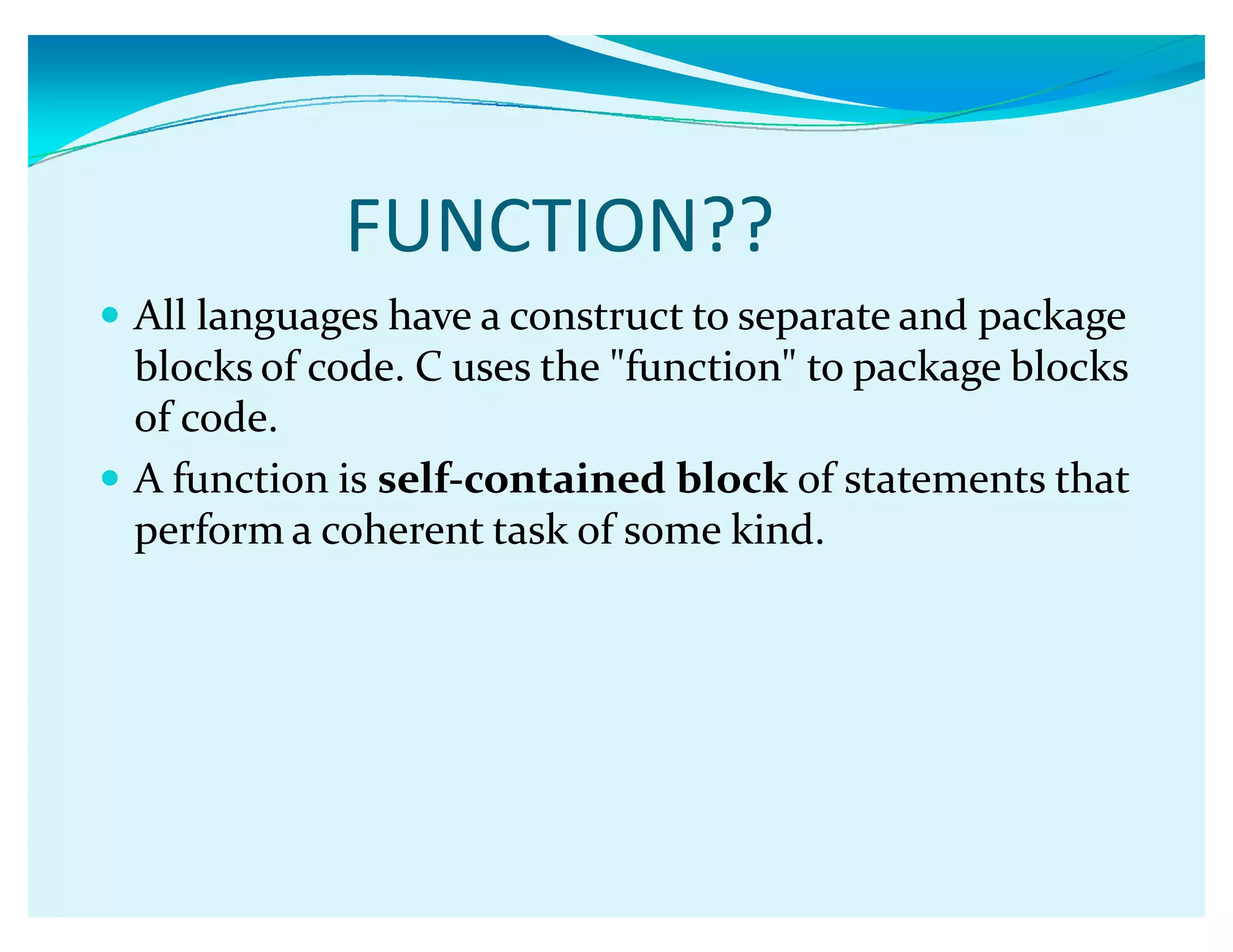 Functions in C allow programmers to package blocks of code that perform tasks. Functions make code reusable and easier to understand by separating code into modular units. A function has a name, list of arguments it takes, and code that is executed when the function is called. Functions can communicate between each other via parameters passed by value or by reference. Parameters passed by value are copied, so changes inside the function don't affect the original variable, while parameters passed by reference allow the function to modify the original variable. Functions can also call themselves recursively.