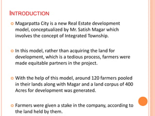 Magarpatta City is an integrated township development project covering 400 acres near Pune, India. It was conceptualized by Satish Magar as a partnership between himself and 120 local farmers, who pooled their agricultural lands and became equity shareholders in proportion to the land contributed. The project was planned and developed in phases from 1993 to the present, including over 7,500 residential units of various types, large commercial areas like an IT park and mall, and amenities to support a population of 60,000. The innovative development model provided significant financial gains for the farmer partners and helped curb unplanned urban growth.